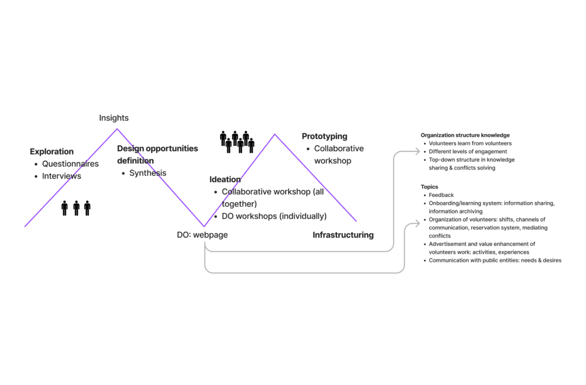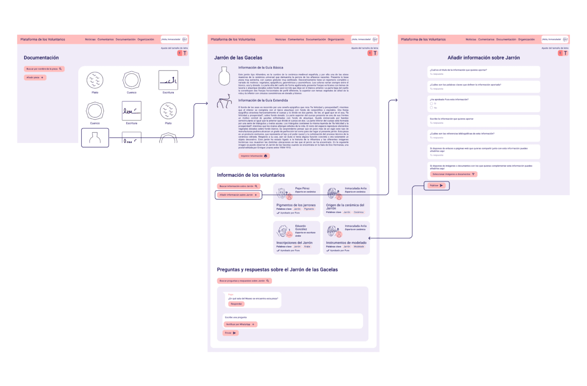 This project is Fermin’s Interaction Design thesis project. Its purpose is to gather recommendations to adapt Participatory Design (PD) activities and UIs to elderly users, through the involvement of an association of elderly museum volunteers. The outcome is the result of a PD process that included forms, interviews, cultural probes, and workshops where the volunteers and designer collaborated tightly to explore volunteers’ needs and find solutions to address them. This process led to the design of a Platform that empowers volunteers’ work and recognizes its value. The Platform includes sections managed by the volunteers to archive information about the museum pieces, share organized activities, and receive feedback from visitors to improve their work.