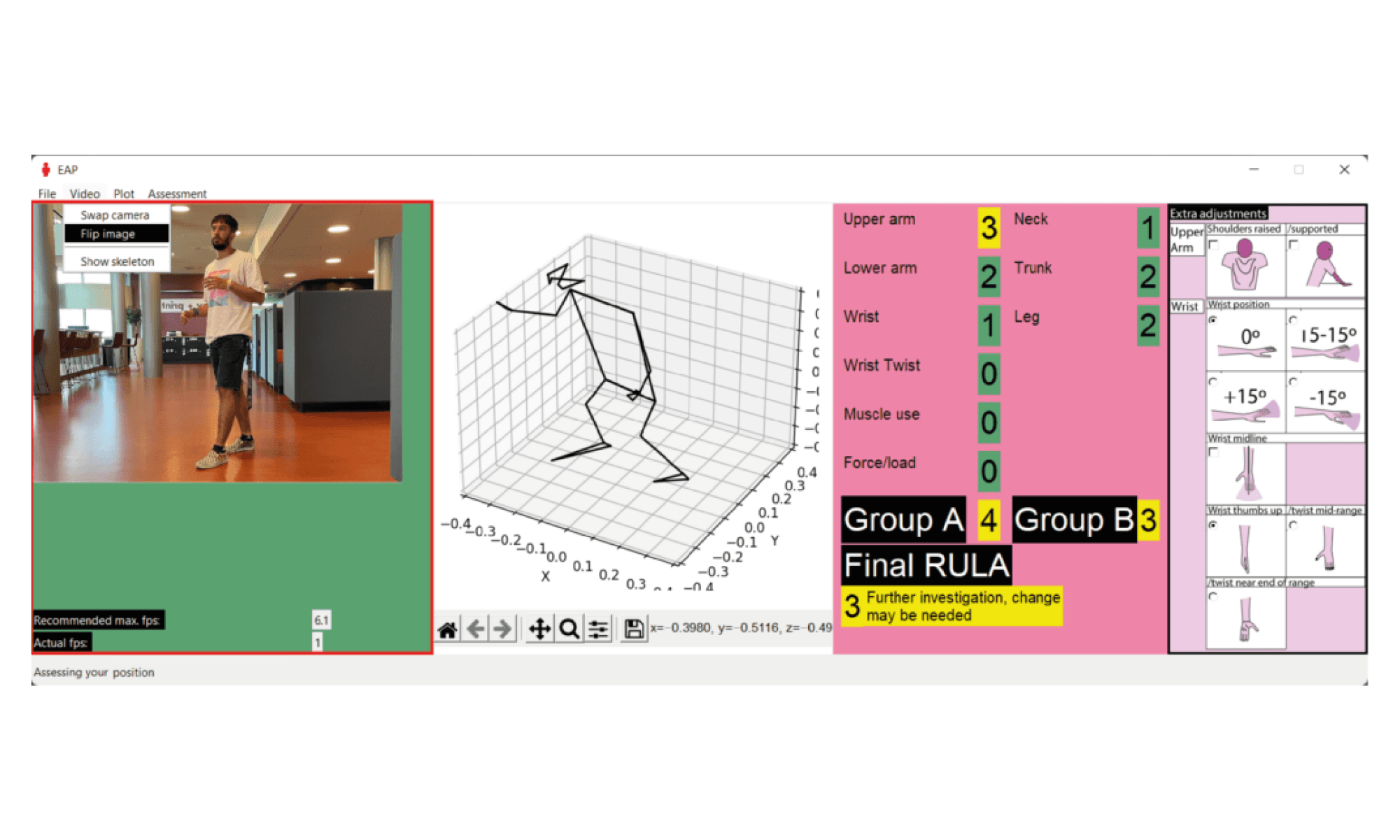 ergonomics with the help of an image recognition AI. However, it had to deal with the following constraints: 1.Low consumption of resources; 2.RULA assessment method; 3.Python as programming language; 4.Real-time assessments.