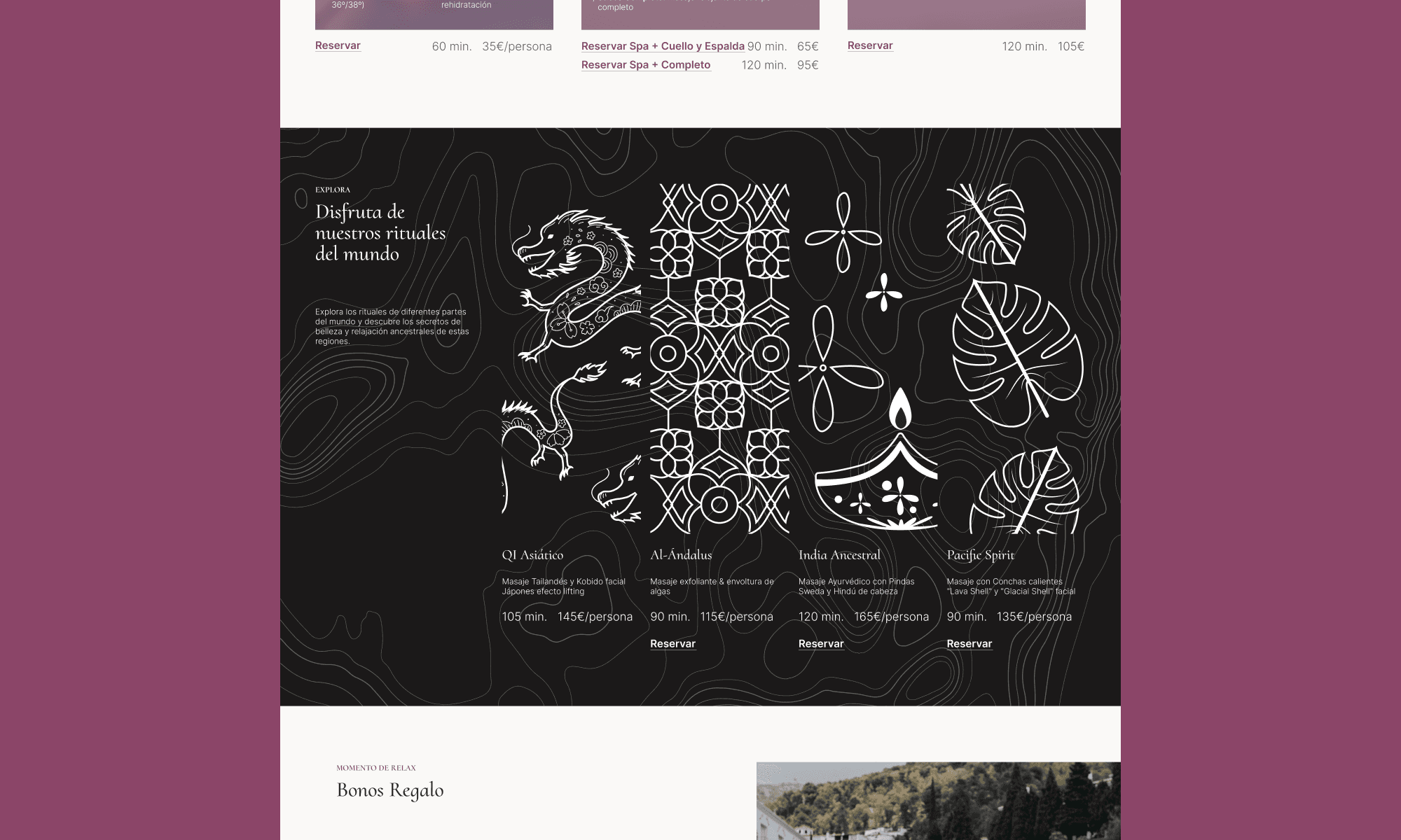 Following user research activities, it was determined that clients prefer to explore and discover new treatments and massages rather than simply reserving their preferred option. To address this, two new sections were created to showcase treatments from around the world and the instruments used in massages.